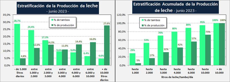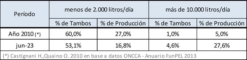 Entre 2023 y 2010 los tambos de menos de 2.000 litros de producción diaria redujeron un 38% su importancia relativa en la producción de leche total y los tambos de más de 10.000 litros diarios de producción, multiplican por más de 5 su participación en la producción.