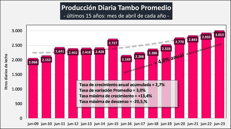 Sobre la base de la producción mensual y la cantidad anual de tambos (SENASA), podemos inferir el tamaño del tambo promedio, unos 3.013 litros de leche diarios para junio de 2023, un 2,7% más que el año anterior. Si evaluamos su comportamiento en el tiempo, a pesar de la disminución en el número de unidades productivas y en el número de vacas, el tambo promedio presenta en el período 2009-2023 una tasa de crecimiento acumulada anual del 2,7%, lo que permite el sostenimiento e incluso aumento de los niveles productivos agregados a nivel país.