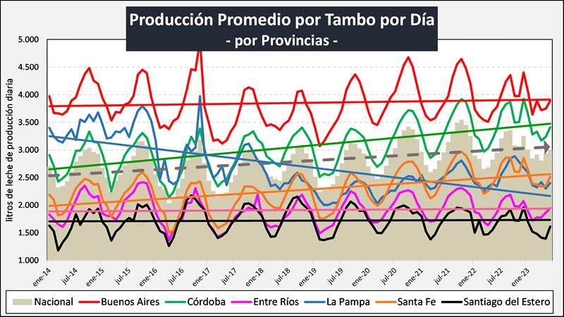 Por último, en el gráfico de abajo se muestra la tendencia en la evolución del tambo promedio nacional y por provincia, donde hay provincias como Córdoba con una importante tendencia al crecimiento (mayo R cuadrado), en la producción de sus unidades productivas, seguida por Santa Fe y luego el resto con una tendencia estable y un solo caso negativa.