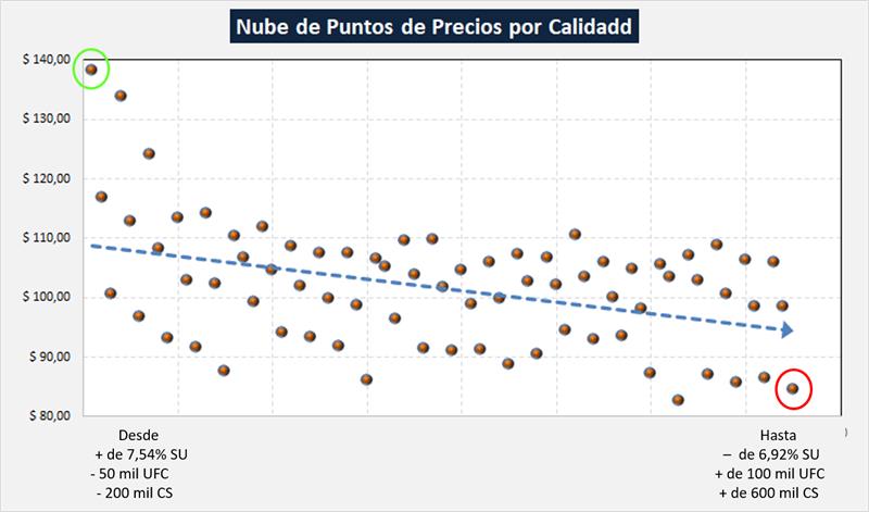 Si elaboramos una nube de puntos con los diferentes precios disponibles en función a las calidades, podemos observar que se da una pendiente descendente de precios a medida que es menor la calidad integral de la leche, pero esa pendiente podría ser mucho más pronunciada si se pretende mejorar/incentivar la mejor calidad de leche.