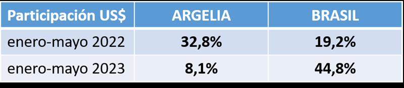 En el último año (ver cuadro de abajo), producto de los bajos precios internacionales sobre todo de la LPE y el fuerte retraso cambiario, se produjo un cambio importante en la estructura de destino, fundamentalmente entre Argelia y Brasil. Por una parte, el Arancel Externo Común favorece la colocación en Brasil y por otro, los bajos precios y la mayor presencia de Nueva Zelanda, por la reducción de importaciones de China, hacen que disminuyan las exportaciones a Argelia.