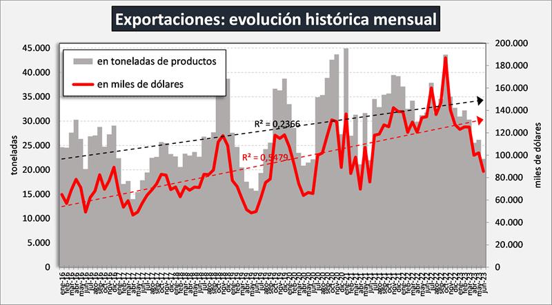 La variación intermensual de las exportaciones fue de -15,0% en volumen y de -16,2% en valor (jun/23 vs. may/23). La variación interanual fue de -29,9% en volumen y -36,3% en valor (jun/23 vs. jun/22). En ambas comparaciones se puede visualizar la caída en volúmenes y en precios.