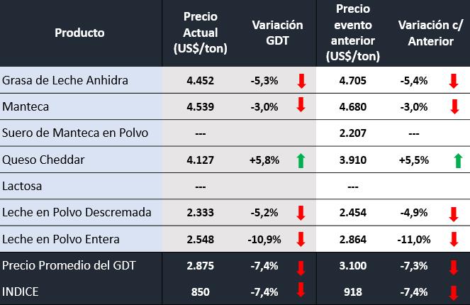 -GDT Price Index indica el promedio del cambio porcentual en los precios para cada especificación, ponderado por la cantidad de cada especificación vendida. GDT proporciona un cambio en el índice de precios de GDT del evento anterior para todos los productos, además de un equivalente para cada grupo de productos y cada combinación de grupo de productos/período de contrato. El índice de precios proporciona un reflejo más preciso de los movimientos de precios entre los eventos comerciales.