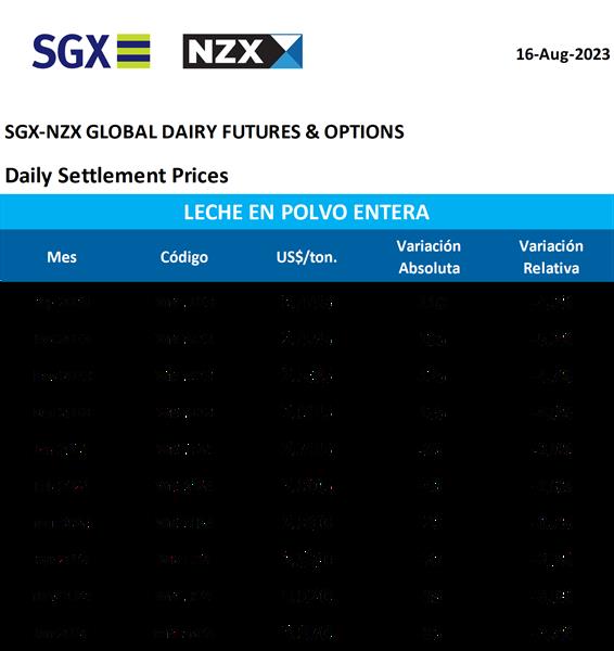 Mercado de Futuros NZX – Leche en Polvo Entera 16/8/2023