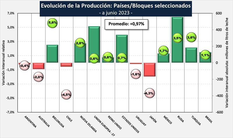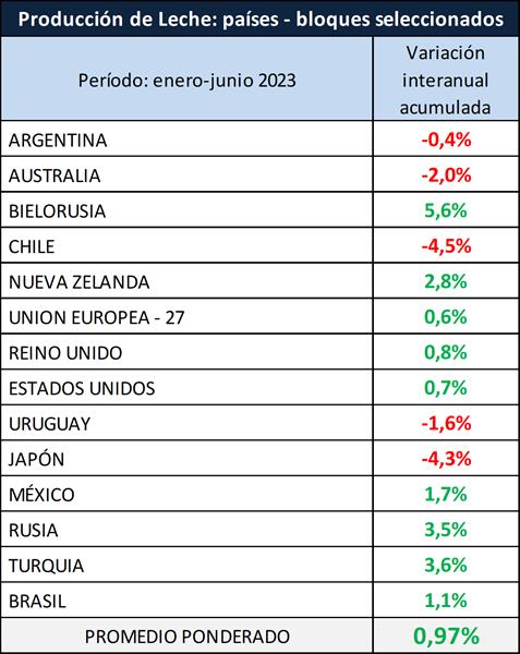 En el cuadro siguiente se toma un grupo seleccionado de los principales países que representan alrededor del 55% de la producción mundial de leche de vaca, en el cual se puede observar un incremento de la producción del 0,97%, para el primer semestre del año 2023 respecto a igual período del año pasado.