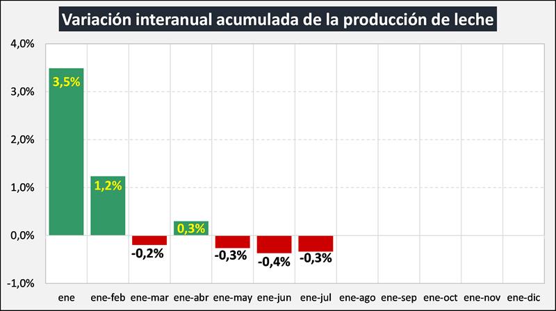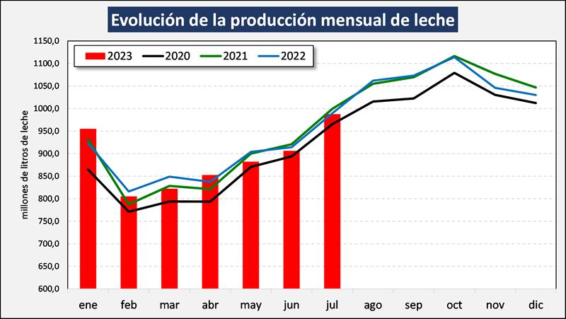En el mes de julio del 2023 la producción fue de 988 millones de litros de leche, esto implica un valor 9,0% por encima del mes anterior (+5,5% en él promedio diario) y un 0,2% menos que igual mes del año anterior.