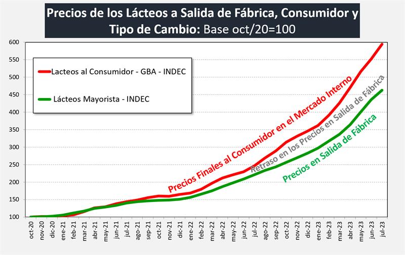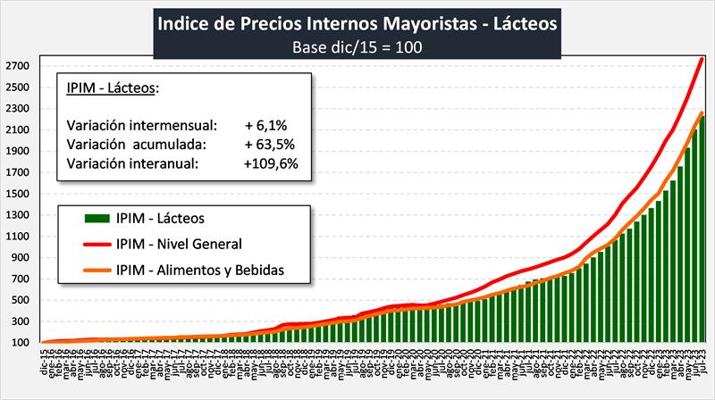 El índice mayorista de precios de los Lácteos registró un aumento de 6,1% en julio de 2023 respecto del mes anterior, en los primeros siete meses de 2023 tuvo un incremento del 63,5% y la comparación anual con julio de 2022 arrojó un incremento del 109,6%.