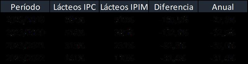 En los últimos 4 años se observa un retraso de precios importante en los precios mayoristas (salida de fábrica) con los minoristas (al consumidor), con tasas de diferencia del orden del 30% anual, como puede verse en el cuadro siguiente. Evidentemente el efecto control de precios que afecta el desenvolvimiento normal de la cadena en general, en particular, es más estricto en las listas de precios en salida de fábrica que en los precios en las góndolas.