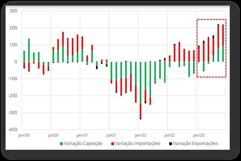 Se puede observar que, en la zona resaltada en el recuadro punteado, el aumento de la disponibilidad en 2023 provino principalmente de los volúmenes importados, aunque en el segundo trimestre del año observamos un crecimiento significativo (+4%) en la producción con respecto al año pasado