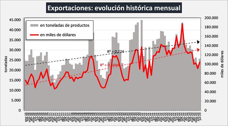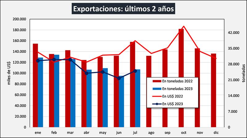 La variación intermensual de las exportaciones fue de +12,5% en volumen y de +15,0% en valor (jul/23 vs. jun/23). La variación interanual fue de -32,2% en volumen y -34,9% en valor (jul/23 vs. jul/22). En ambas comparaciones se puede visualizar la caída en volúmenes y en precios.