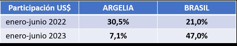 En el último año (ver cuadro de abajo), producto de los bajos precios internacionales sobre todo de la LPE y el fuerte retraso cambiario, se produjo un cambio importante en la estructura de destino, fundamentalmente entre Argelia y Brasil. Por una parte, el Arancel Externo Común favorece la colocación en Brasil y por otra, los bajos precios y la mayor presencia de Nueva Zelanda, por la reducción de importaciones de China, hacen que disminuyan las exportaciones a Argelia.