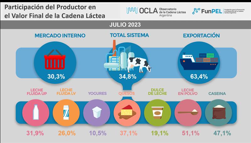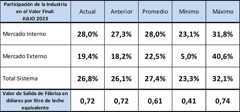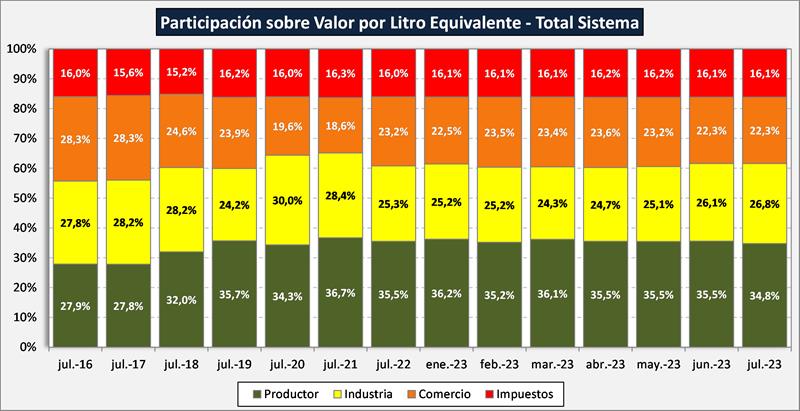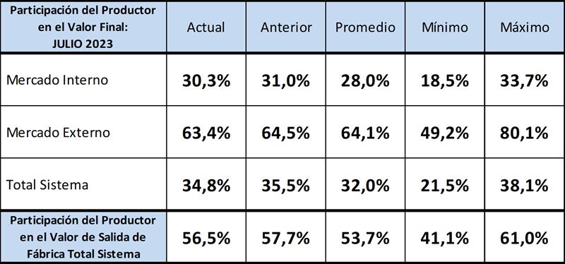 La participación del productor en el total del sistema fue para julio de 2023 del 34,8%, 0,7 puntos por debajo del mes anterior, bastante por encima de la media del 32,0%. Se produjo una baja de 0,7 punto en los valores finales de mercado interno y una baja de 1,1 puntos porcentuales en la participación de los valores de mercado externo, colocándola 0,7 puntos por debajo de la media histórica de la serie disponible (64,1%). La participación del productor sobre el valor de salida de fábrica (precio al que vende la industria) fue de 56,5%, 1,2 puntos debajo del mes pasado y 2,8 puntos encima del promedio de la serie (53,7%).