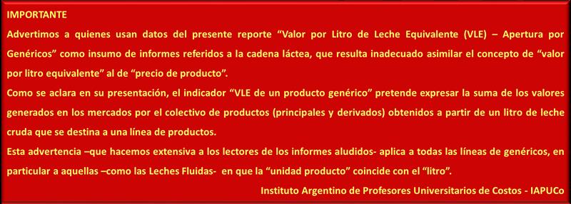 Sobre la base del análisis que mensualmente realiza el Instituto Argentino de Profesores Universitarios de Costos – IAPUCo que referencia la valorización en la cadena sobre el Valor por Litro de Leche Equivalente – VLE, se muestra en el siguiente gráfico el agregado de valor en cada etapa de la cadena en términos relativos de participación respecto al precio final total del sistema (mercado interno y exportación).