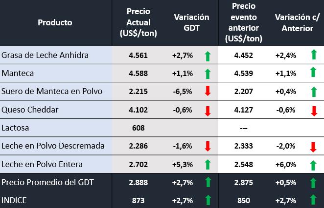 -GDT Price Index indica el promedio del cambio porcentual en los precios para cada especificación, ponderado por la cantidad de cada especificación vendida. GDT proporciona un cambio en el índice de precios de GDT del evento anterior para todos los productos, además de un equivalente para cada grupo de productos y cada combinación de grupo de productos/período de contrato. El índice de precios proporciona un reflejo más preciso de los movimientos de precios entre los eventos comerciales.