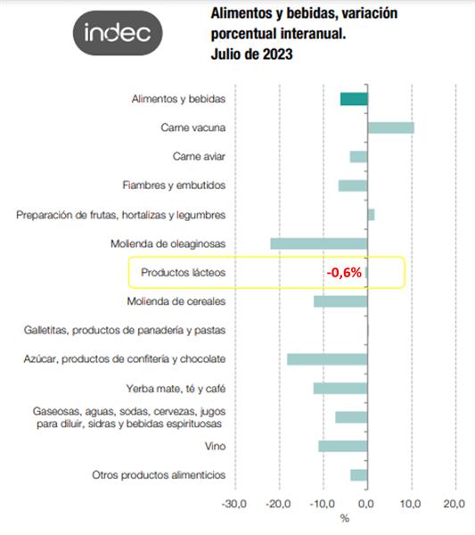 En los productos lácteos el índice fue de 116,2 lo que indica una baja del 18,9% con el mes anterior (-21,5% en el promedio diario), el interanual cayó un 0,6% y presentó una suba del 0,8% en el período enero-julio de 2023 respecto a igual período del año anterior.