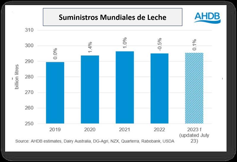 Se espera que la previsión de suministro mundial de leche para 2023 sea del 0,1%. Estas estimaciones podrían ser un poco pesimistas todavía, ya que la producción en lo que va del año en las regiones clave ha aumentado un 0,8% interanual, aunque es probable que la caída de los precios y las difíciles condiciones climáticas en muchas regiones reduzcan el rendimiento. en la segunda mitad del año, lo que se refleja en las estimaciones finales.