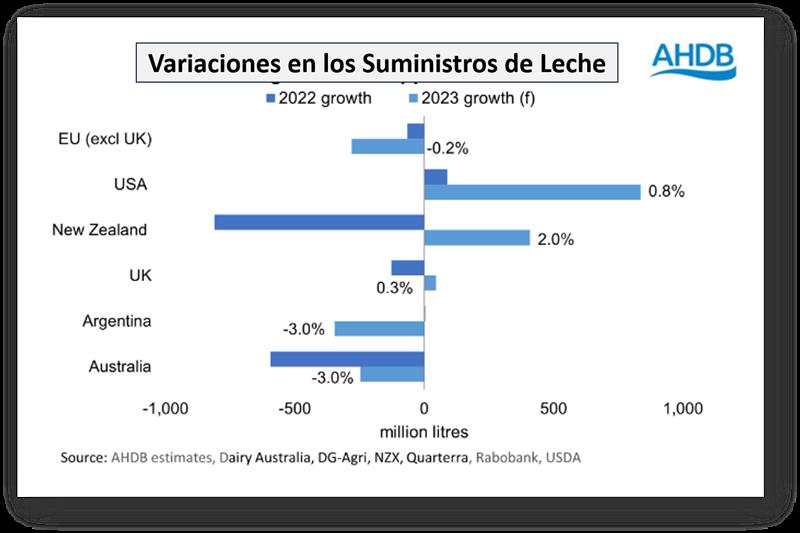 Se estima que Estados Unidos (0,8%), Reino Unido (0,3%) y Nueva Zelanda (2,0%) registrarán cierto crecimiento. A pesar del crecimiento de las entregas de leche en la UE en primavera, las predicciones indican una caída en la segunda mitad del año debido al aumento de los sacrificios impulsado por la caída de los precios de la leche y los altos costos de los insumos, con una reducción prevista del -0,2%. Tanto Australia como Argentina estiman caídas en la producción de leche del 3,0%.