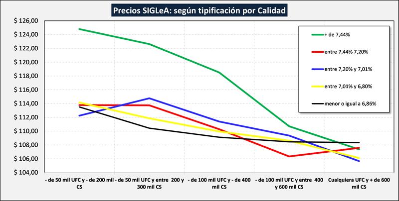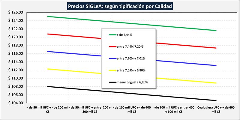En el cuadro de tipificación, la leche comercializada se divide en 25 estratos según composición y calidad higiénico-sanitaria y, dentro de cada estrato, se muestra un promedio ponderado del precio del total de esos litros y además un promedio ponderado del 20% superior e inferior de los precios.