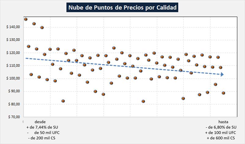 Si elaboramos una nube de puntos con los diferentes precios disponibles en función a las calidades, podemos observar que se da una pendiente descendente de precios a medida que es menor la calidad integral de la leche, pero esa pendiente podría ser mucho más pronunciada si se pretende mejorar/incentivar la mejor calidad de leche.