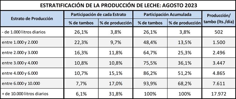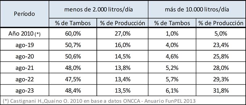 Puede verse en el cuadro siguiente al comparar con datos disponibles del año 2010, que en un extremo disminuye la participación tanto en cantidad de tambos como en el volumen de producción de las unidades productivas de menos de 2.000 litros diarios y en el otro extremo de la estratificación, se incrementa la participación de las unidades de más de 10.000 litros diarios.