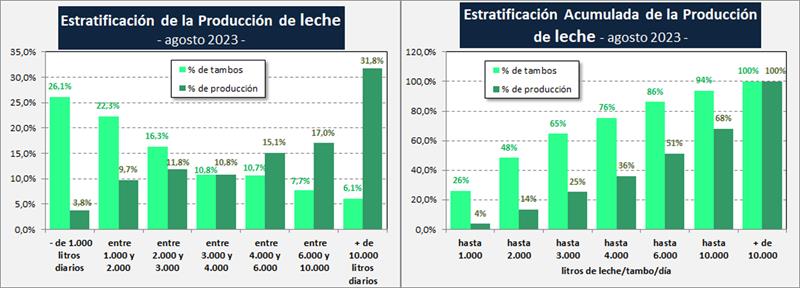 Puede observarse que los casi 600 tambos del estrato de + de 10.000 litros de producción diaria, produjeron durante el mes de agosto un promedio de 17.972 litros diarios, representaron el 6,1% del total de tambos y aportaron el 31,8% de la producción total. Esto es un 135% más que lo que aportaron los casi 5.000 tambos de menos de 2.000 litros diarios y que fueron el 48,4% de los tambos totales, que representaron el 13,5% de la producción nacional.