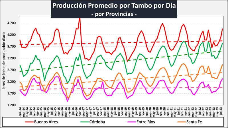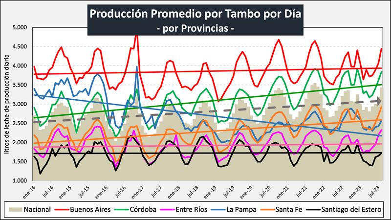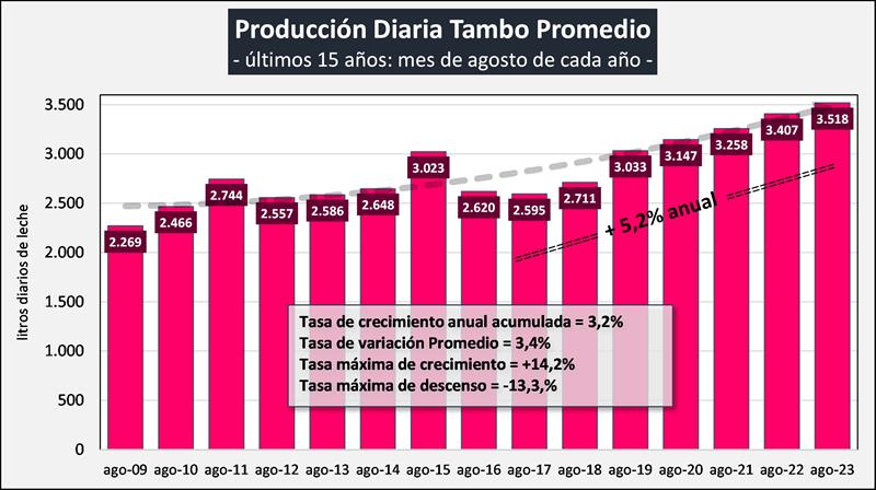 Sobre la base de la producción mensual y la cantidad anual de tambos (SENASA), podemos inferir el tamaño del tambo promedio, unos 3.518 litros de leche diarios para agosto de 2023, un 3,2% más que el año anterior. Si evaluamos su comportamiento en el tiempo, a pesar de la disminución en el número de unidades productivas y en el número de vacas, el tambo promedio presenta en el período 2009-2023 una tasa de crecimiento acumulada anual del 3,2%, lo que permite el sostenimiento e incluso aumento de los niveles productivos agregados a nivel país.