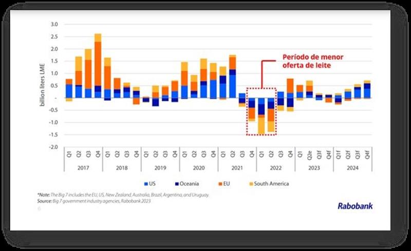 Sin embargo, desde la segunda mitad de 2022, el mercado ha visto una desaceleración en la demanda mundial de productos lácteos. China, principal comprador de productos lácteos del mundo, "retiró el pie" de las compras, lo que contribuyó a acentuar la presión a la baja sobre los precios de los lácteos en el mercado internacional.