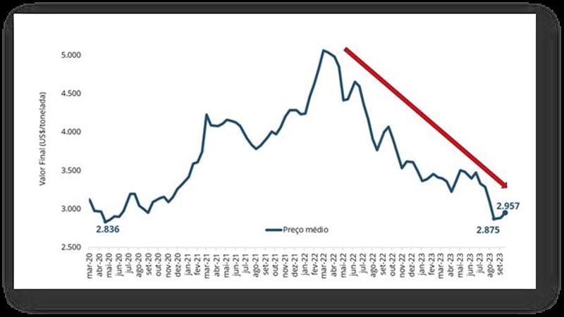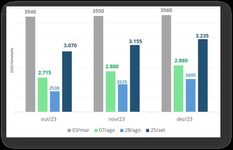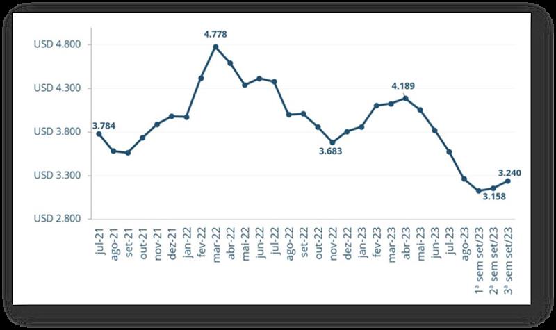 En sentido contrario, la producción de los países exportadores volvió a mostrar un pequeño aumento, como podemos observar en el periodo 2023 en el gráfico 2. Así, en un escenario de oferta más estable y demanda débil, los precios experimentaron una caída vertiginosa, alcanzando en agosto el más bajo de los últimos 3 años.