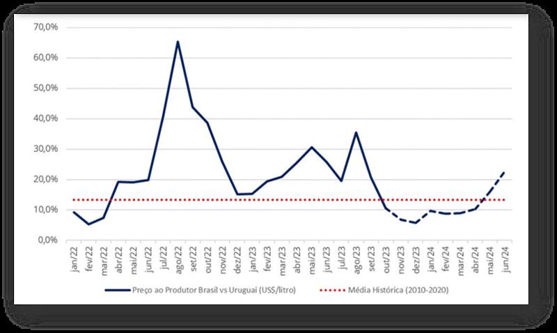 En este escenario, con los precios de los productos importados creciendo y con el precio de la leche aquí en Brasil ya en niveles más bajos (después de la secuencia de caídas que hemos visto en los últimos meses), el diferencial competitivo en el precio de las importaciones tiende a disminuir aún más. Además, lo que hace que las importaciones sean menos atractivas. A continuación, podemos observar la diferencia del precio al productor, en dólares por litro, en promedio en Brasil en relación al precio que recibe el productor en Uruguay.