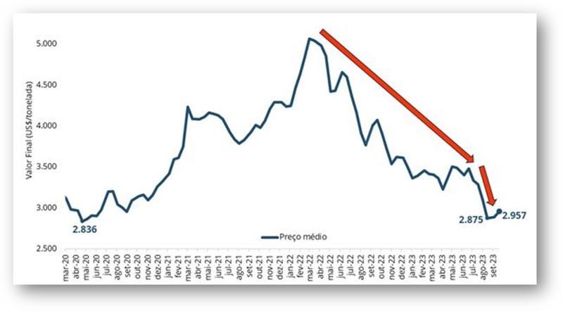 En el gráfico siguiente podemos ver la variación del precio medio de la subasta Global Dairy Trade (GDT). Los precios de los lácteos alcanzaron su punto máximo a principios de 2022 y desde entonces han mostrado una clara tendencia a la baja. En los últimos meses, esta caída fue aún más intensa, provocando que el precio promedio de subasta del GDT en agosto alcanzara el nivel más bajo de los últimos 3 años.