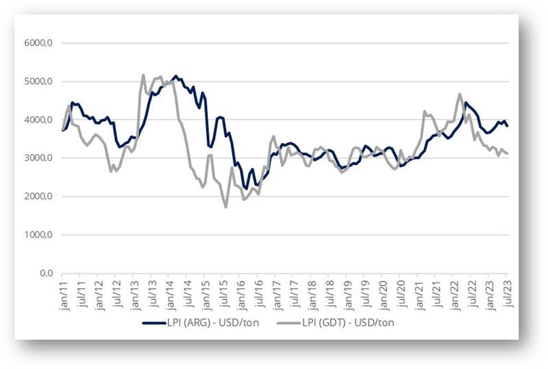 Al ser un gran exportador de lácteos, los precios de exportación argentinos están muy influenciados por los precios del mercado internacional (que tienen como principal guía la subasta GDT). En el período enero/2011 a julio/2023, los precios de exportación de leche entera en polvo (LPE) de Argentina muestran una correlación de +81% con el precio de subasta LPI GDT de los 4 meses anteriores.
