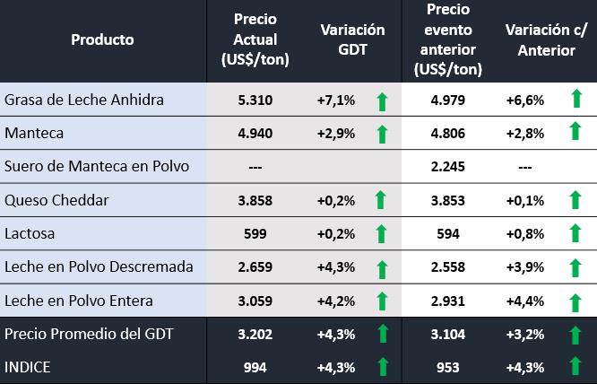 -GDT Price Index indica el promedio del cambio porcentual en los precios para cada especificación, ponderado por la cantidad de cada especificación vendida. GDT proporciona un cambio en el índice de precios de GDT del evento anterior para todos los productos, además de un equivalente para cada grupo de productos y cada combinación de grupo de productos/período de contrato. El índice de precios proporciona un reflejo más preciso de los movimientos de precios entre los eventos comerciales.
