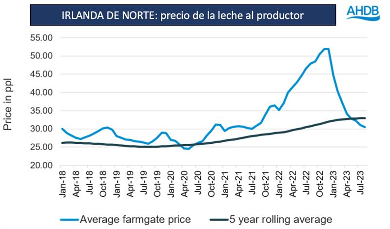 Los productores de lácteos de Irlanda del Norte exportan alrededor del 80 % de sus productos y, por lo tanto, están aún más expuestos a los caprichos de los mercados globales. En Gran Bretaña, más leche se destina al procesamiento fresco y más en contratos minoristas alineados que se basan en el costo de producción y ofrecen algo de aislamiento de los cambios de precios impulsados por el mercado. La diferencia de precios actual entre los precios de GB y IN se ha ampliado tras la menor demanda en el extranjero