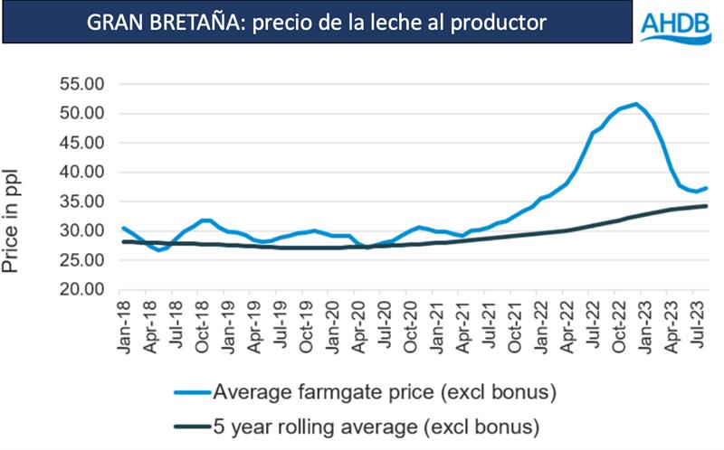 El precio promedio de la leche al productor en agosto fue reportado como 30,53ppl (0,37 US$/litro), una disminución de casi el 36 % interanual. Durante el año en curso, los precios han caído más de un 40 % y siguen disminuyendo. Según fuentes de la industria, se informó que el precio promedio base de la leche era de alrededor de 28,47 ppm (0,35 US$/litro) en agosto. Se estima que el precio de equilibrio es de 35-36 ppl (0,42 US$/litro). Según el sindicato, los rendimientos de la leche se han bajado un 40 % en comparación con esta época del año pasado y la mayoría de los productores lácteos no están ganando lo suficiente para cubrir los costos de producción. El siguiente gráfico muestra la tendencia de los precios durante los últimos cinco años.