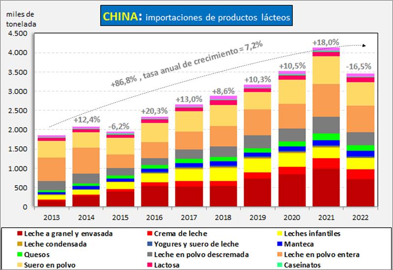 Las importaciones de productos lácteos de China venían creciendo significativamente entre 2013-2021 (salvo en la crisis de 2015) a una tasa acumulativa del 10,6% anual, Y con la caída del 16,5% en 2022 la tasa se redujo al 7,2% anual. De cualquier manera, sigue siendo China el gran motor de la demanda de lácteos en el mercado internacional.