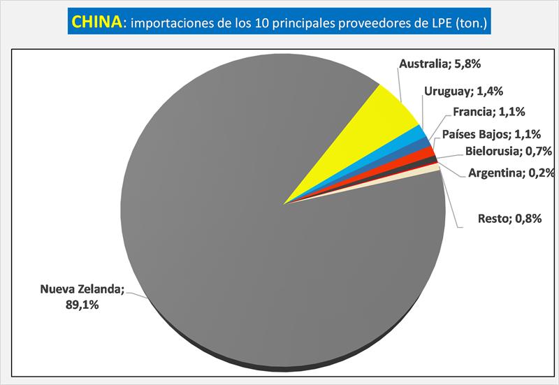 China es el principal importador de Leche en Polvo Entera y su principal proveedor es Nueva Zelanda quien ostenta el 89% de participación de ese producto en el gigante asiático en lo que va de 2023, igual participación que en 2022.