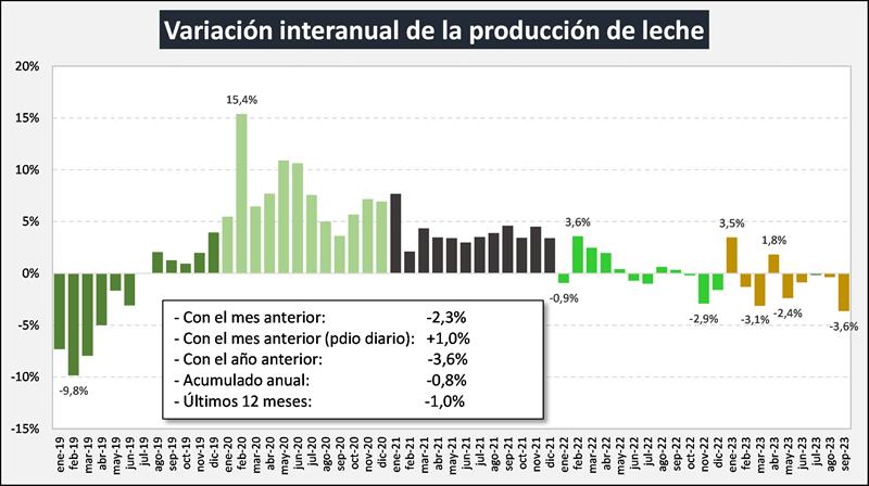 En el mes de septiembre del 2023 la producción fue de 1.04 millones de litros de leche, esto implica un valor 2,3% por debajo del mes anterior (+1,0% en él promedio diario) y un 3,6% menos que igual mes del año anterior.