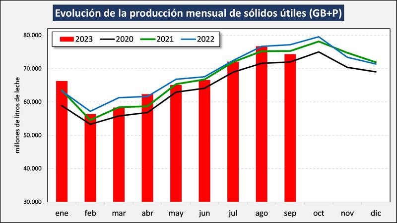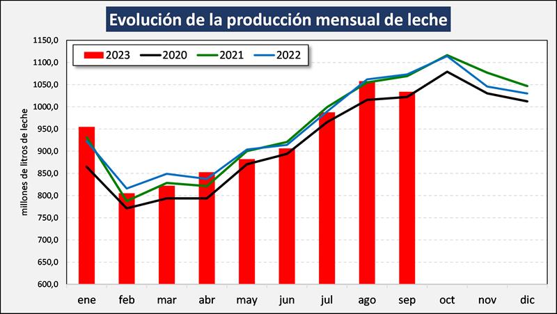 Normalmente la producción en el mes de septiembre crece entre 3 y 4% respecto a agosto (en promedio diario), este año ha tenido un crecimiento inferior, producto de la seca generalizada y prolongada que sufrieron en diferente medida todas las regiones productivas y que redujeron la disponibilidad de pasturas, verdeos y reservas forrajeras y que persiste aún en muchas zonas.