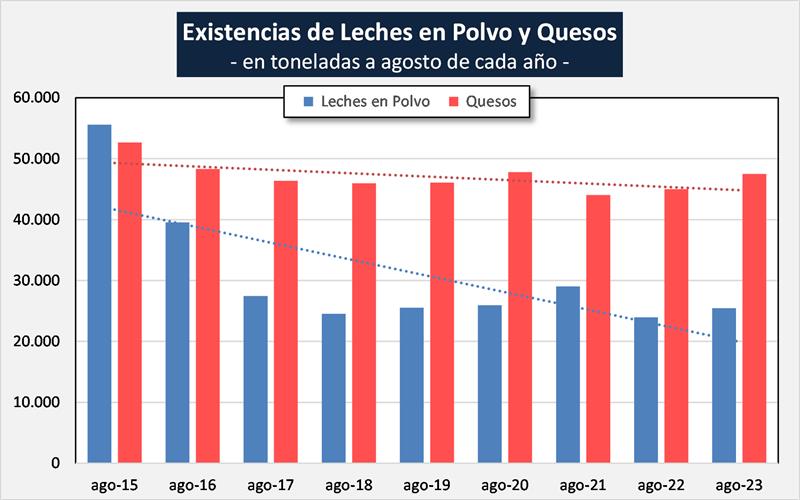 Evolución de las existencias de leches en polvo (enteras y descremadas) y quesos (duros, semiduros, blandos y muy blandos) a agosto de los últimos 9 años: