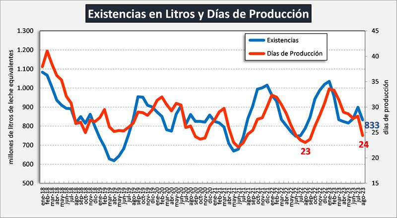 Evolución de las existencias medidas en litros de leche equivalentes y en días de producción de leche: