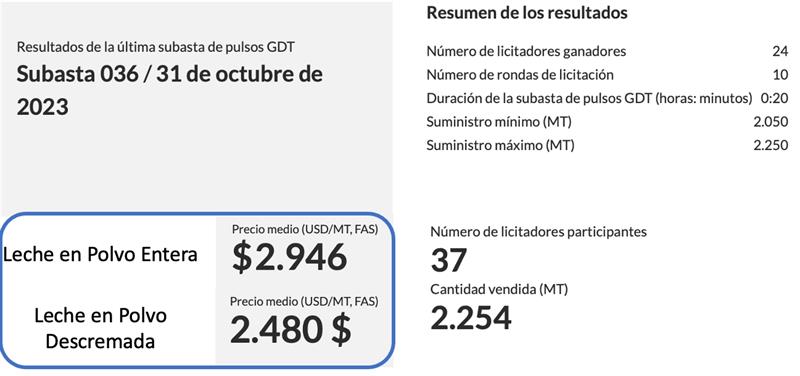 La Subasta Nº 036 se ha llevado ha cabo en el día de hoy, martes 31 de octubre, donde el precio promedio obtenido para la LPE ha sido de 2.946 US$/t, lo que representa una disminución de 1,2% respecto a lo publicado en la última GDT pulse (2.981 US$/t) y de 3,7% respecto al último evento del GDT (3.059 US$/t).