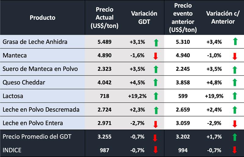 -GDT Price Index indica el promedio del cambio porcentual en los precios para cada especificación, ponderado por la cantidad de cada especificación vendida. GDT proporciona un cambio en el índice de precios de GDT del evento anterior para todos los productos, además de un equivalente para cada grupo de productos y cada combinación de grupo de productos/período de contrato. El índice de precios proporciona un reflejo más preciso de los movimientos de precios entre los eventos comerciales.