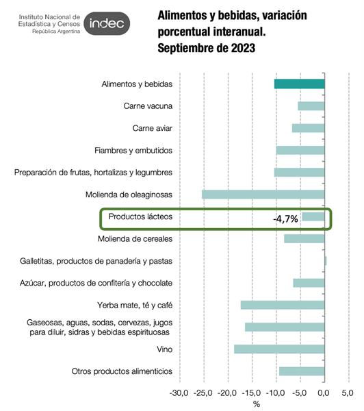 En los productos lácteos el índice fue de 119,0 lo que indica una caída del 12,4% con el mes anterior, el interanual cayó un 4,7% y casi no presenta variación en el período enero-septiembre de 2023 respecto a igual período del año anterior.