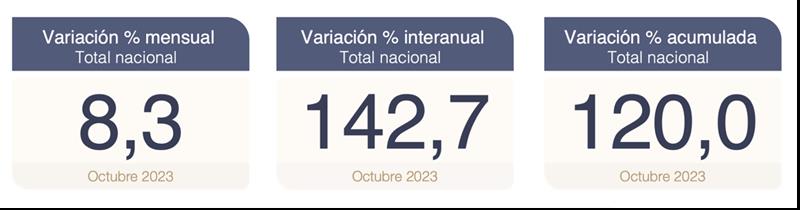 Los alimentos y bebidas no alcohólicas en general, crecieron un 7,7% en octubre de 2023, 134,2% en enero-octubre 2023 respecto a igual período del año anterior y un 150,1% en el interanual