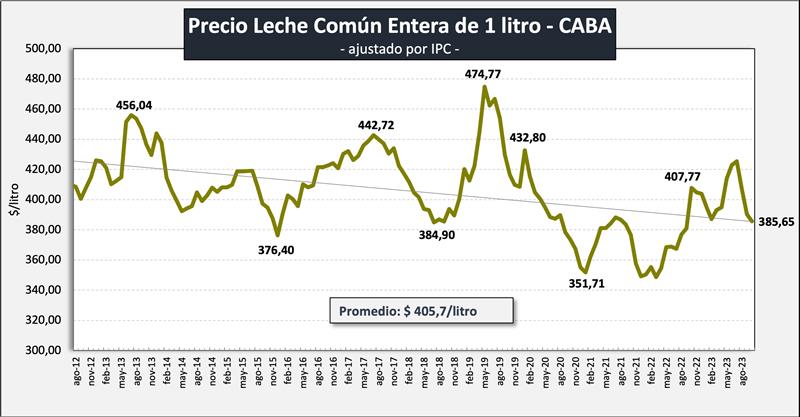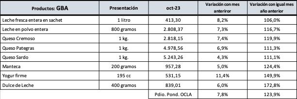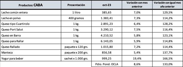 Según datos publicados por la Dirección General de Estadísticas y Censos - Ministerio de Hacienda del Gobierno de la Ciudad de Buenos Aires, los precios de los productos lácteos de esta canasta, tuvieron un crecimiento mensual promedio ponderado del 8,6%, del 117,3% en el acumulado del año y un incremento interanual del 133,0%. El ponderado es elaborado por OCLA sobre el mismo criterio mencionado para la canasta GBA de INDEC