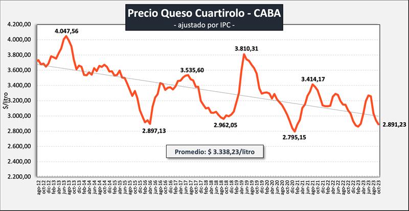En el caso del queso cuartirolo mantiene también una tendencia decreciente en la serie de 11 años. El precio de octubre está 13,4% por debajo de la media y 28,6% por debajo del máximo alcanzado en 2013.