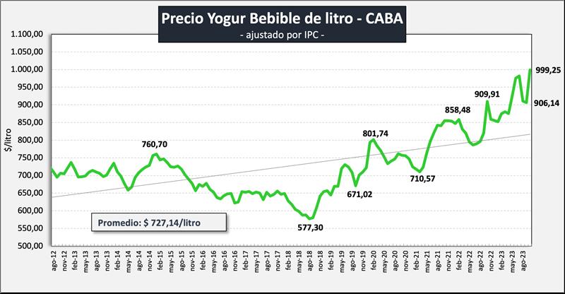 La situación de los yogures bebibles de litro es diferente, sostienen el nivel de consumo de la categoría, y sus precios se ajustan por encima del ritmo inflacionario, con algunos altibajos. El precio actual está 37,4% encima de la media de la serie. Lamentablemente tiran para abajo el promedio del mix, ya que su aumento de ventas no fue acompañado por las ventas de yogures en pote, postres y flanes que tienen un mayor valor por litro equivalente.