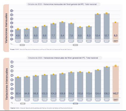 El nivel general del Índice de precios al consumidor (IPC) representativo del total de hogares del país registró en septiembre una variación de 8,3% con relación al mes anterior, acumuló un 120,0% en los primeros diez meses del año y la variación interanual fue del 142,7%.
