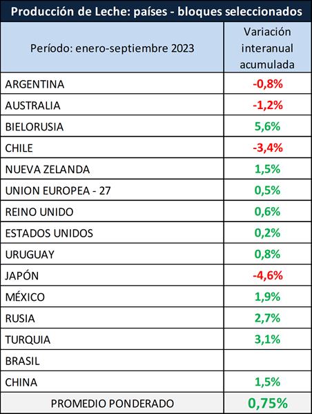 En el cuadro siguiente se toma un grupo seleccionado de los principales países que representan alrededor del 55% de la producción mundial de leche de vaca, en el cual se puede observar un incremento de la producción del 0,75%, para el período enero-septiembre de 2023 respecto a igual período del año pasado.