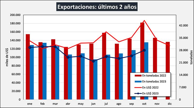 En el último año (ver cuadro de abajo), producto de los bajos precios internacionales sobre todo de la LPE y el fuerte retraso cambiario, se produjo un cambio importante en la estructura de destino, fundamentalmente entre Argelia y Brasil. Por una parte, el Arancel Externo Común favorece la colocación en Brasil y por otra, los bajos precios y la mayor presencia de Nueva Zelanda, por la reducción de importaciones de China, hacen que disminuyan las exportaciones a Argelia. Variación de la participación entre Argelia y Brasil en el total de exportaciones en dólares para el período enero-septiembre, últimos 3 años: Participación en US$ Totales Exportados ARGELIA BRASIL enero-septiembre 2021 25,4% 25,9% enero-septiembre 2022 22,9% 29,8% enero-septiembre 2023 6,3% 47,9% Mayor contundencia respecto a la mayor incidencia en las exportaciones a Brasil, lo aporta el gráfico siguiente donde se puede visualizar que para LPE Brasil participa con el 65,4% del total. ![]() En el gráfico siguiente se puede observar la evolución del precio de la Leche en Polvo Entera en bolsas de 25 kgs. con el nomenclador Común Arancelario 04.02.21.10 900M actualizado hasta el mes de octubre de 2023: ![]() Este gráfico muestra la evolución del precio de la Leche en Polvo Entera en bolsas de 25 kgs. (nuestro principal producto de exportación), en el cual se puede ver que los precios de mediados de 2022 fueron de los más altos de los últimos 7 años, pero comenzaron un ciclo descendente, llegando en diciembre 2022/enero 2023 a US$ 3.600/ton. y luego se recuperaron por la mayor incidencia de precios provenientes de las exportaciones a Brasil (tener en cuenta que estos precios tienen ventaja para Argentina por la presencia del Arancel Externo Común, respecto a los precios que tiene por ejemplo Nueva Zelanda). Los precios de Argentina presentan un delay (retraso) entre el precio internacional de referencia y el precio de nuestras exportaciones, debido a que entre la concreción del negocio y su materialización (momento en que se refleja en las estadísticas) hay no menos de dos a tres meses. De todas maneras, los precios de la región para leche en polvo entera son entre 10 y 15% superiores a los que indican el Global Dairy Trade y el Mercado de Futuros SGX-NZX. Como vimos, se viene produciendo este año una importante baja en las exportaciones de Leche en Polvo, no ocurriendo lo mismo con los quesos, que son casi el 30% del valor exportado (principalmente Mozzarella y Quesos de Pasta Semidura). Por último, en el gráfico de abajo se muestra la tendencia creciente en el volumen y en el monto de las exportaciones de Argentina, a pesar de la caída este último año. ![]() La cadena esperaba una recuperación de los precios internacionales, que por suerte se viene dando lentamente en los últimos dos meses y pedía al gobierno que se mejoren las condiciones de exportación, es decir, eliminar los derechos de exportación y mejorar el valor del tipo de cambio. El Decreto 506/23 de Suspensión por 90 días de los Derechos de Exportación y los Decretos 549/23 que establece un Tipo de Cambio Diferencial por 30 días (70% de dólar mayorista BCRA y 30% del dólar contado con liquidación) y el Decreto 597/23 (50/50), vienen a completar un panorama muy favorable para las exportaciones y generan expectativas en función al mejor poder de compra de la leche para la exportación (ver: https://www.ocla.org.ar/noticias/28050023-decreto-n-549-nomenclatura-comun-del-mercosur ). Cabe recordar al respecto que el destino de exportación que se lleva el 20% de la producción total y que puede mejorar en estos últimos dos meses, se complementa con el 75% de la producción que se debe colocar en el mercado interno con “precios cuidados”, “canasta de precios congelados” y en un escenario de sobreoferta, fuerte deterioro del poder adquisitivo de los ingresos de la población y un exponencial crecimiento de la informalidad impositiva. elaborado por el OCLA con información de la DNL – MAGyP y del INDEC